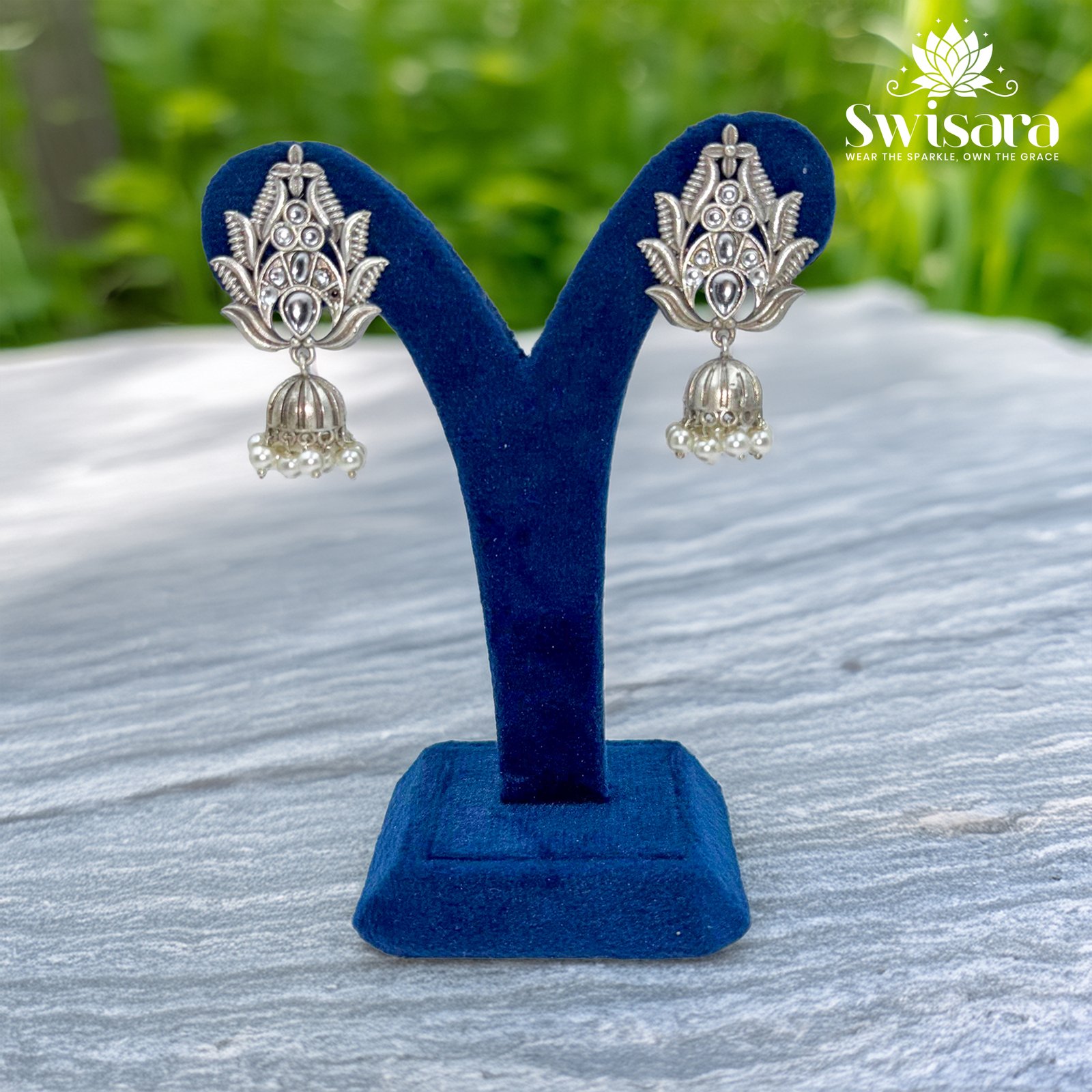 These beautifully detailed jhumkas feature a lotus-inspired oxidised design with tiny pearl drops, hand-crafted on a brass base with silver polish for long-lasting finish.