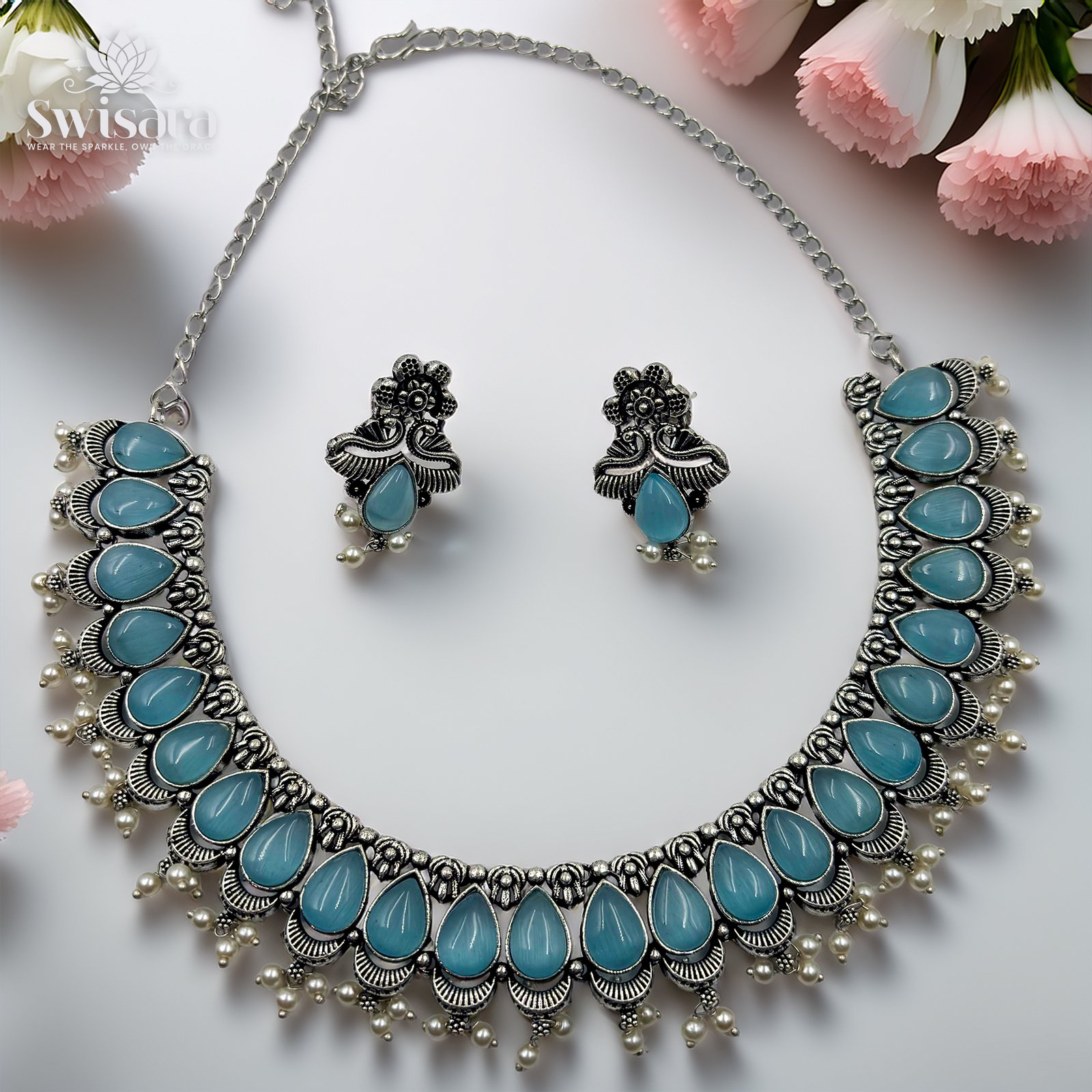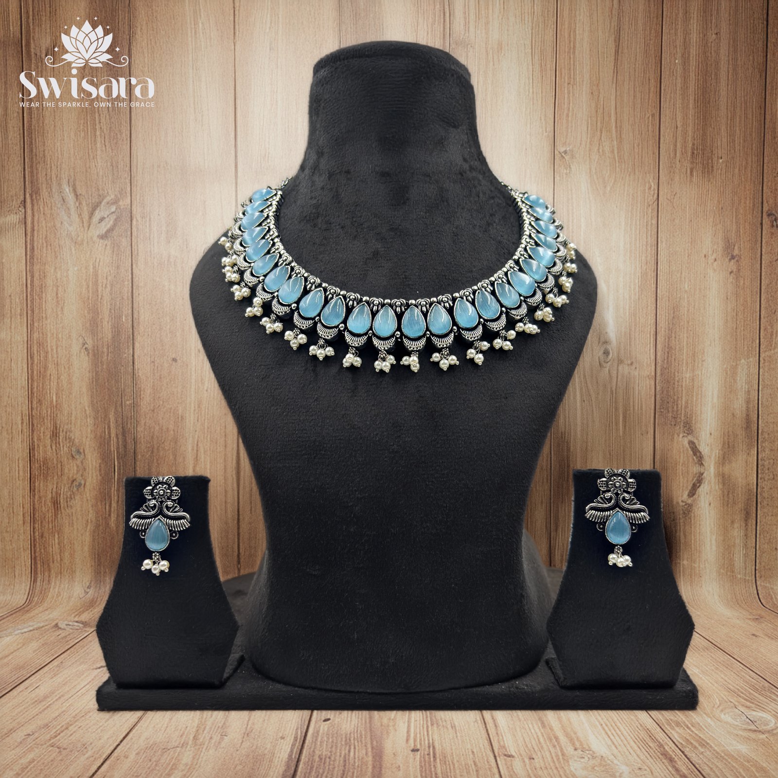 Oxidised silver necklace & earrings set on brass base with silver polish and sky blue teardrop stones. Elegant and lightweight design ideal for festive occasions.