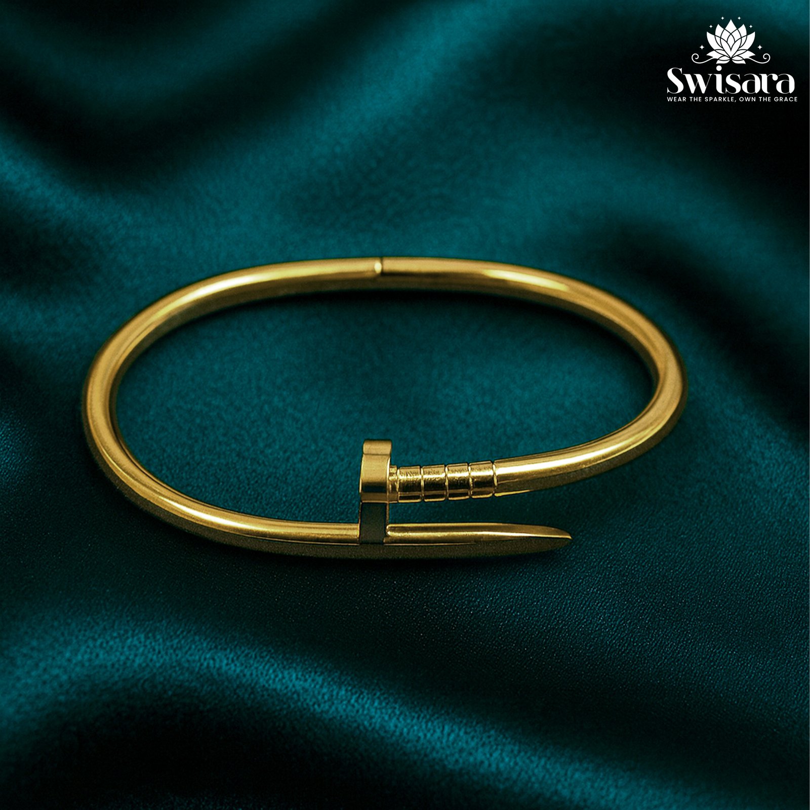Meet the Bolt Curve Nail Bangle — a minimal statement that speaks volumes. Inspired by industrial design, this high-polish gold-tone bracelet curves like a sculpted nail, giving your wrist an edgy, confident look. Its streamlined silhouette is perfect for stacking or wearing solo for a strong modern style. Whether styled with denim or formalwear, this piece is a symbol of fearless fashion.