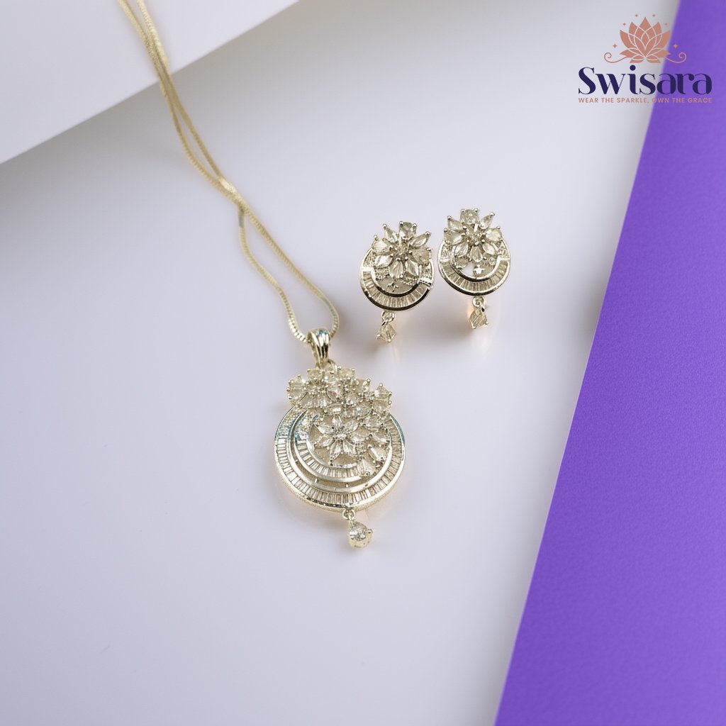 The Celeste Radiance Pendant Set by Swisara embodies dazzling elegance with its frosted floral-inspired design. Featuring a radiant pendant and matching earrings, the imitation jewelry exudes sophistication while remaining lightweight and easy to wear.