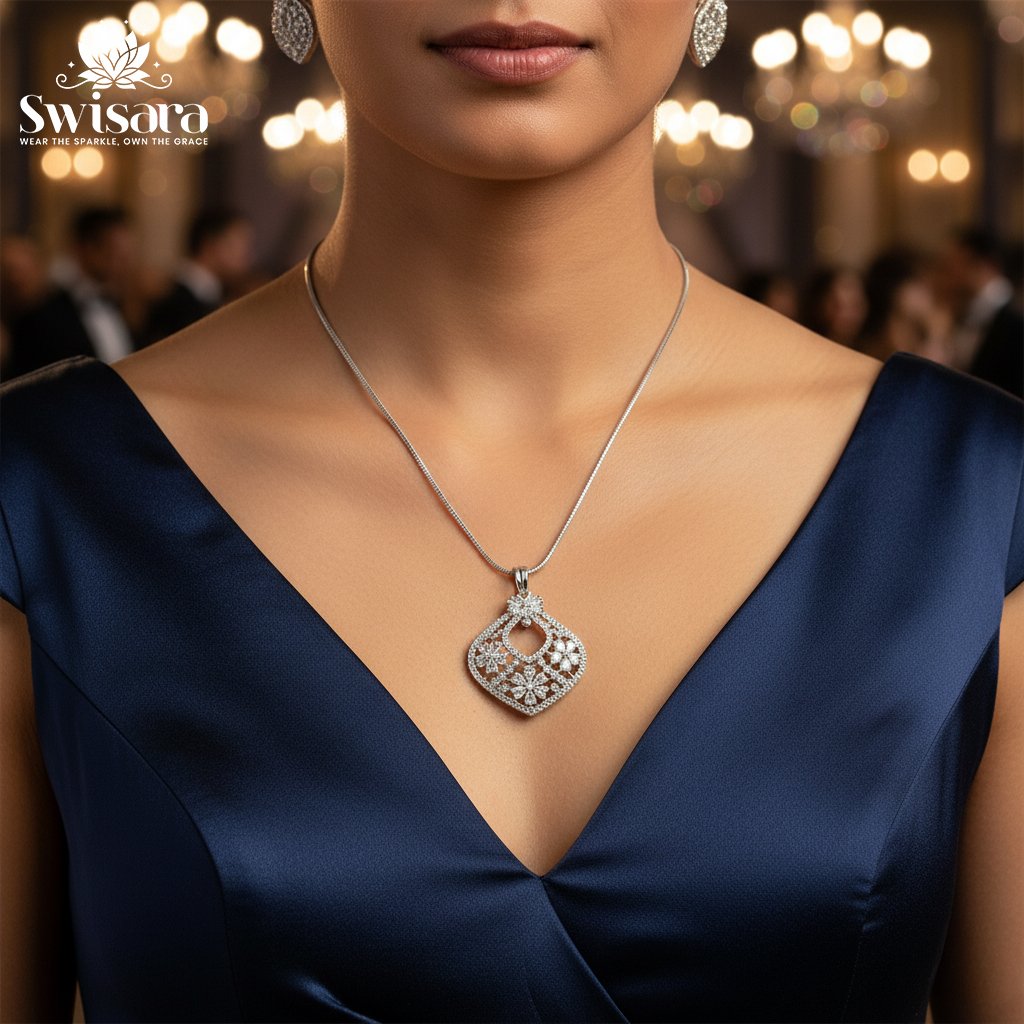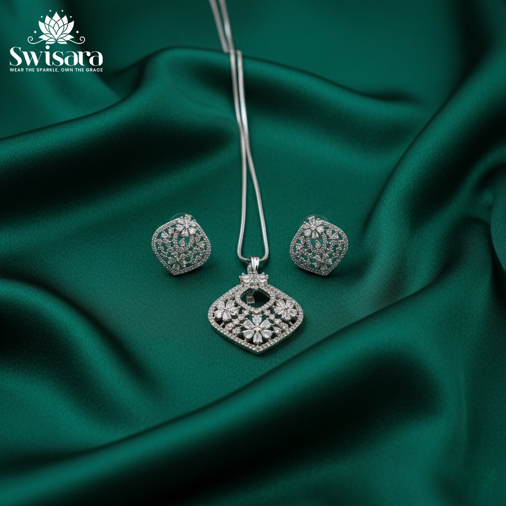 The Diamond Frost Pendant Set by Swisara brings graceful sparkle and timeless charm to your collection. Crafted in a stone-studded design with a frost-like shine, this imitation jewelry set captures elegance with intricate floral detailing.