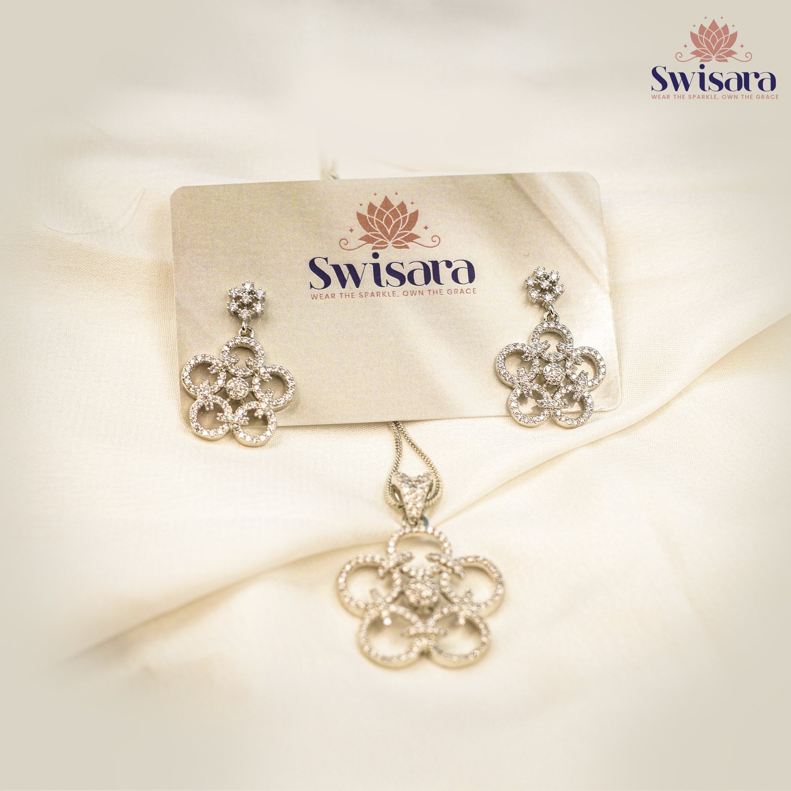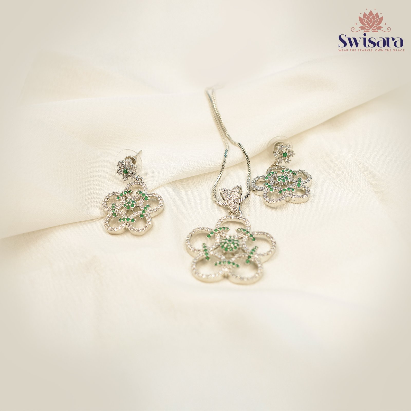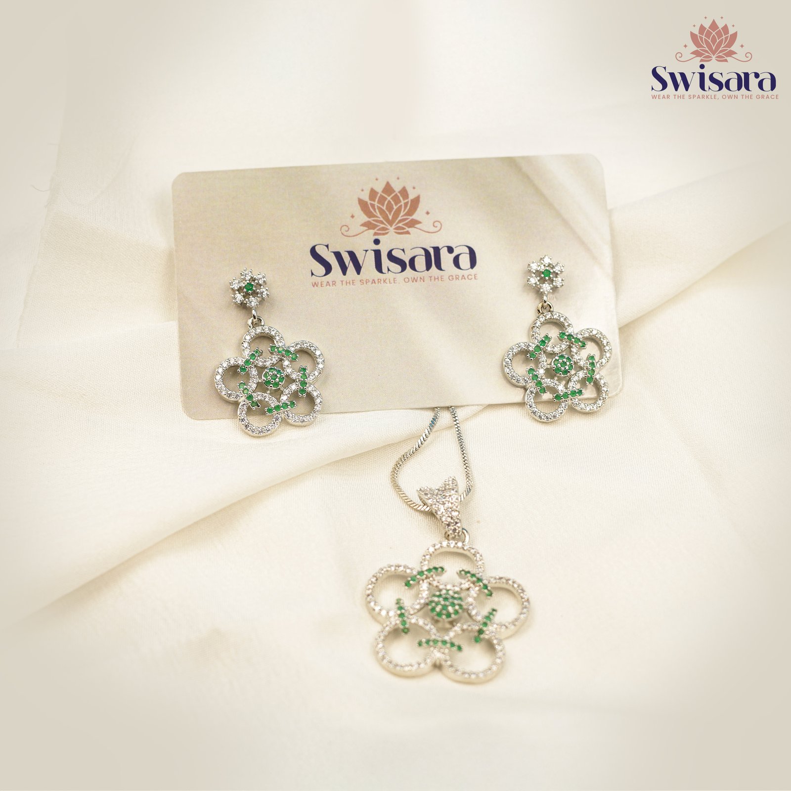 Adorn your neckline with Swisara’s Floral Bloom Pendant Set – a graceful blend of intricate floral design and shimmering CZ stones. Available in two enchanting variants – pure white and elegant green – this lightweight set pairs effortlessly with ethnic and festive wear.