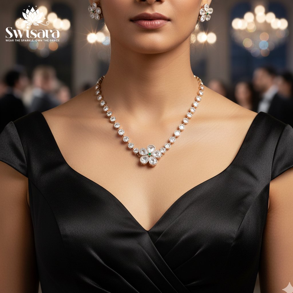 Swisara’s Floral Kundan Set brings timeless beauty to your festive and wedding wardrobe. The necklace is designed with shimmering white Kundan stones and a green enamel centerpiece, creating a striking floral-inspired motif.
