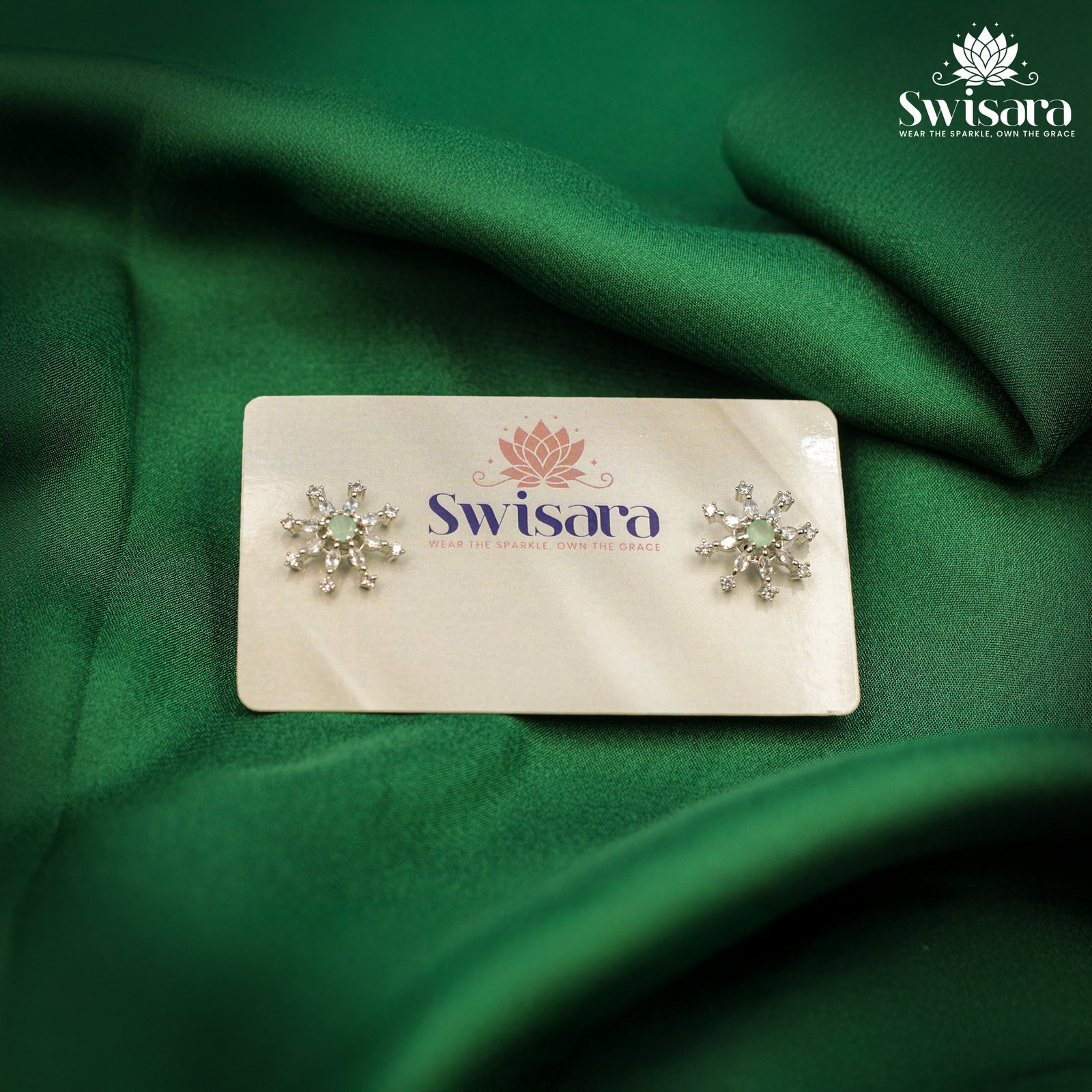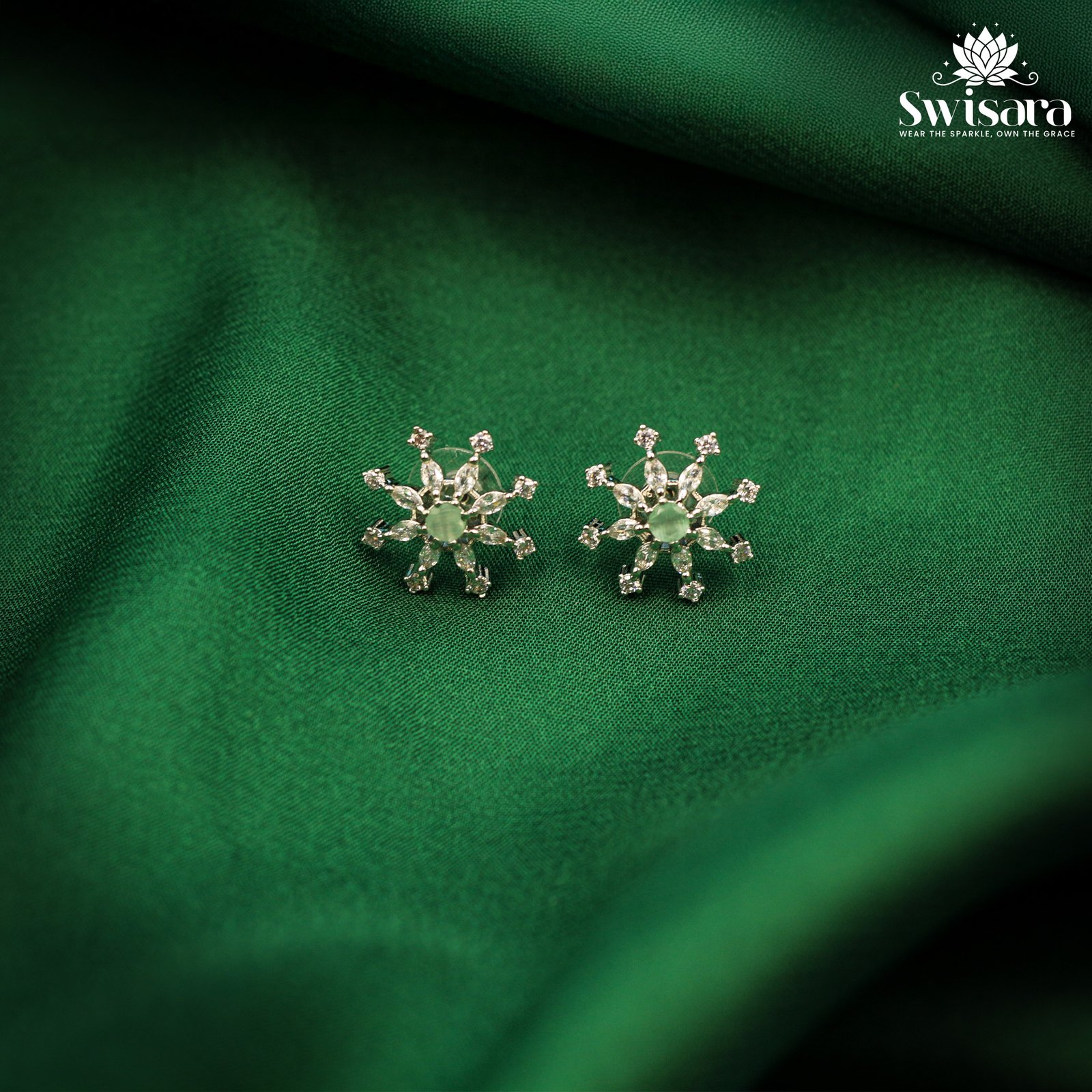 Delicate floral studs with mint green center and icy crystal petals — elegant for everyday and festive wear.