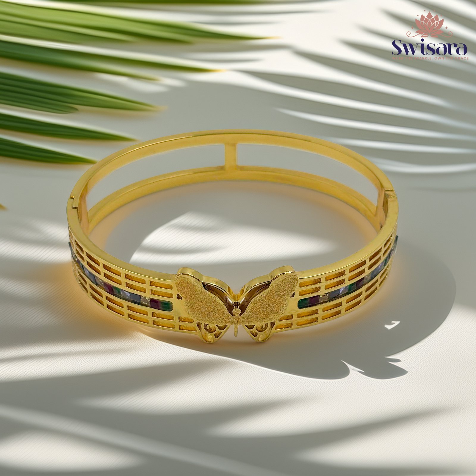The Golden Butterfly Mosaic Bangle by Swisara brings a touch of grace and vibrance to your jewelry collection. Crafted in a radiant gold-tone finish, it features a delicate butterfly motif paired with multicolored mosaic inlays, symbolizing both elegance and joyful charm.