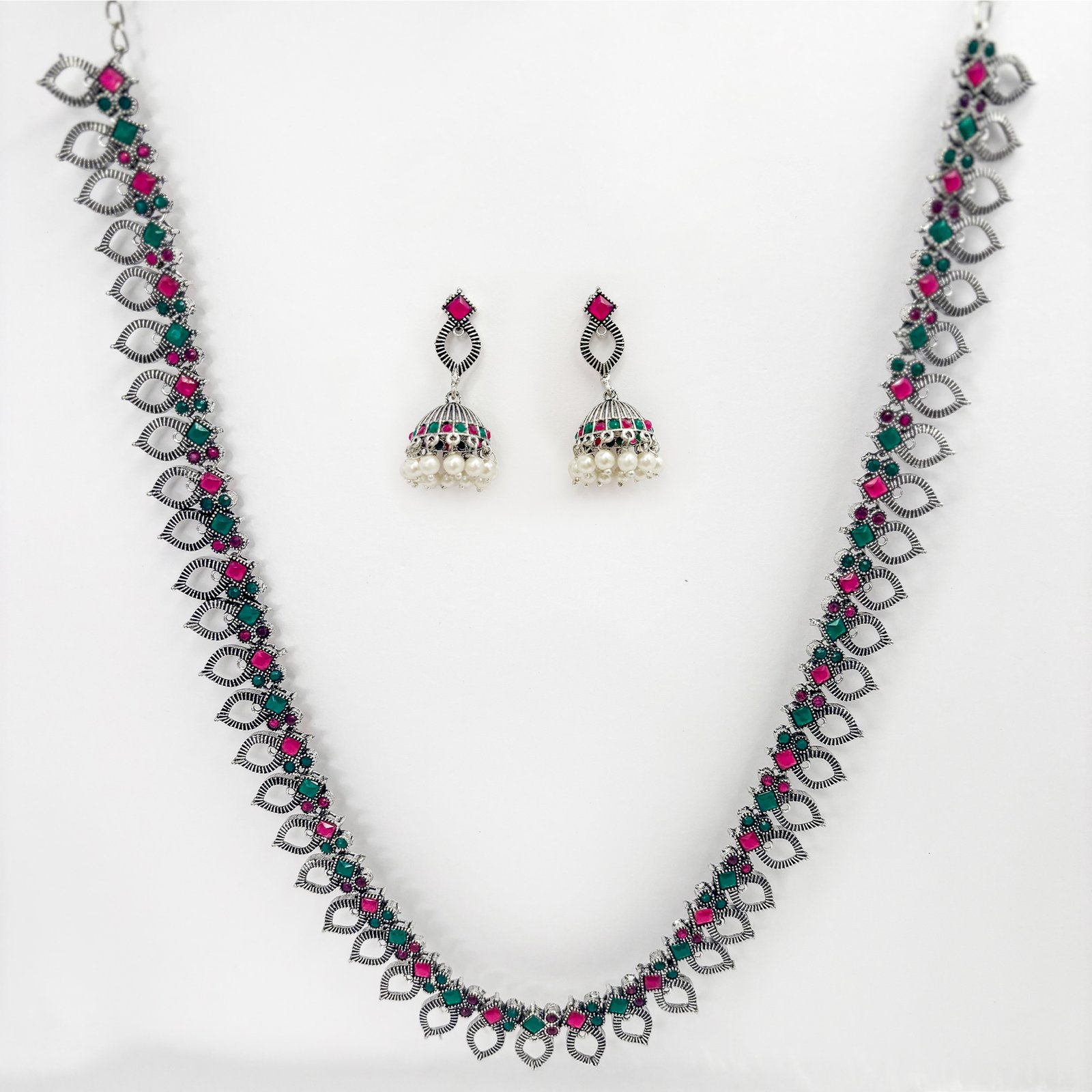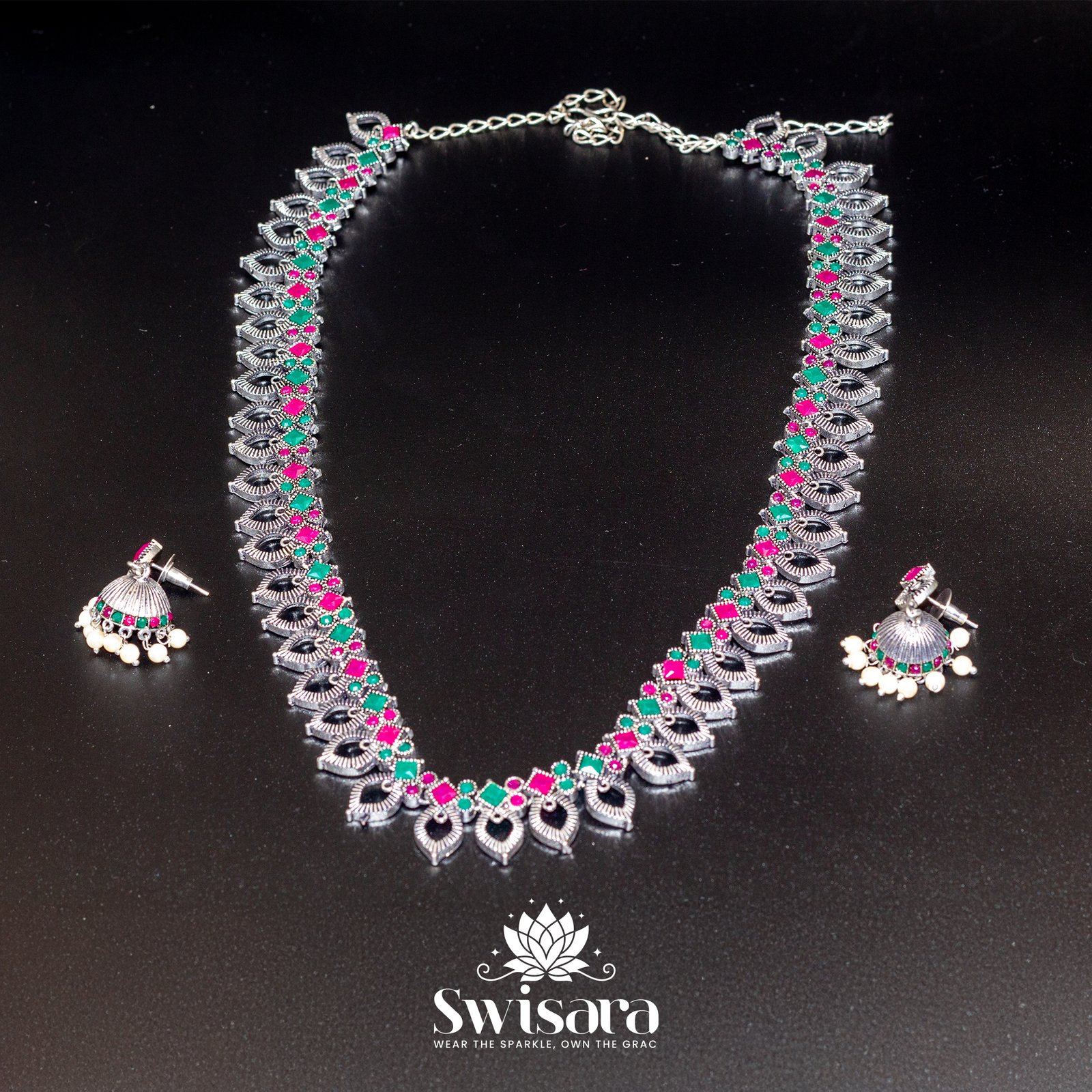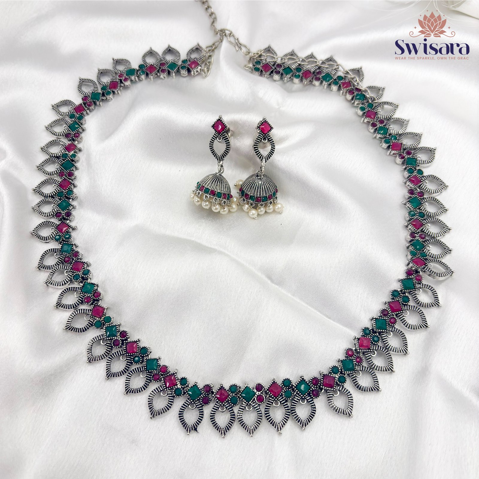 Turn heads with Swisara’s Mehfil Oxidised Dual-Tone Leaf Necklace Set, a striking fusion of tradition and statement design. The necklace features an alternating pattern of green and magenta stones framed in delicate oxidised leaf motifs. Complementing it are beautiful dome-shaped jhumka earrings with stone detailing and faux pearl hangings. Perfect for festive functions and ethnic celebrations.