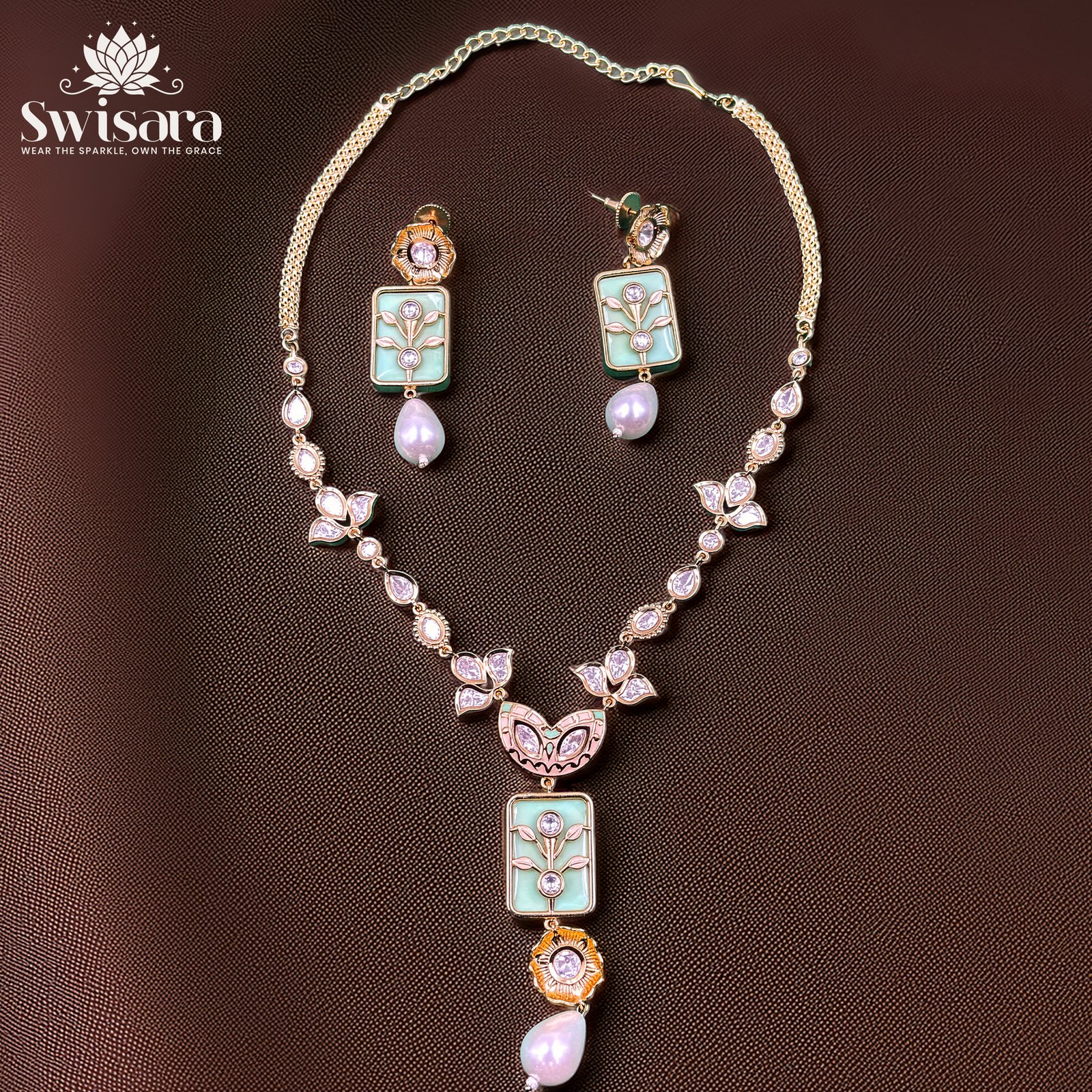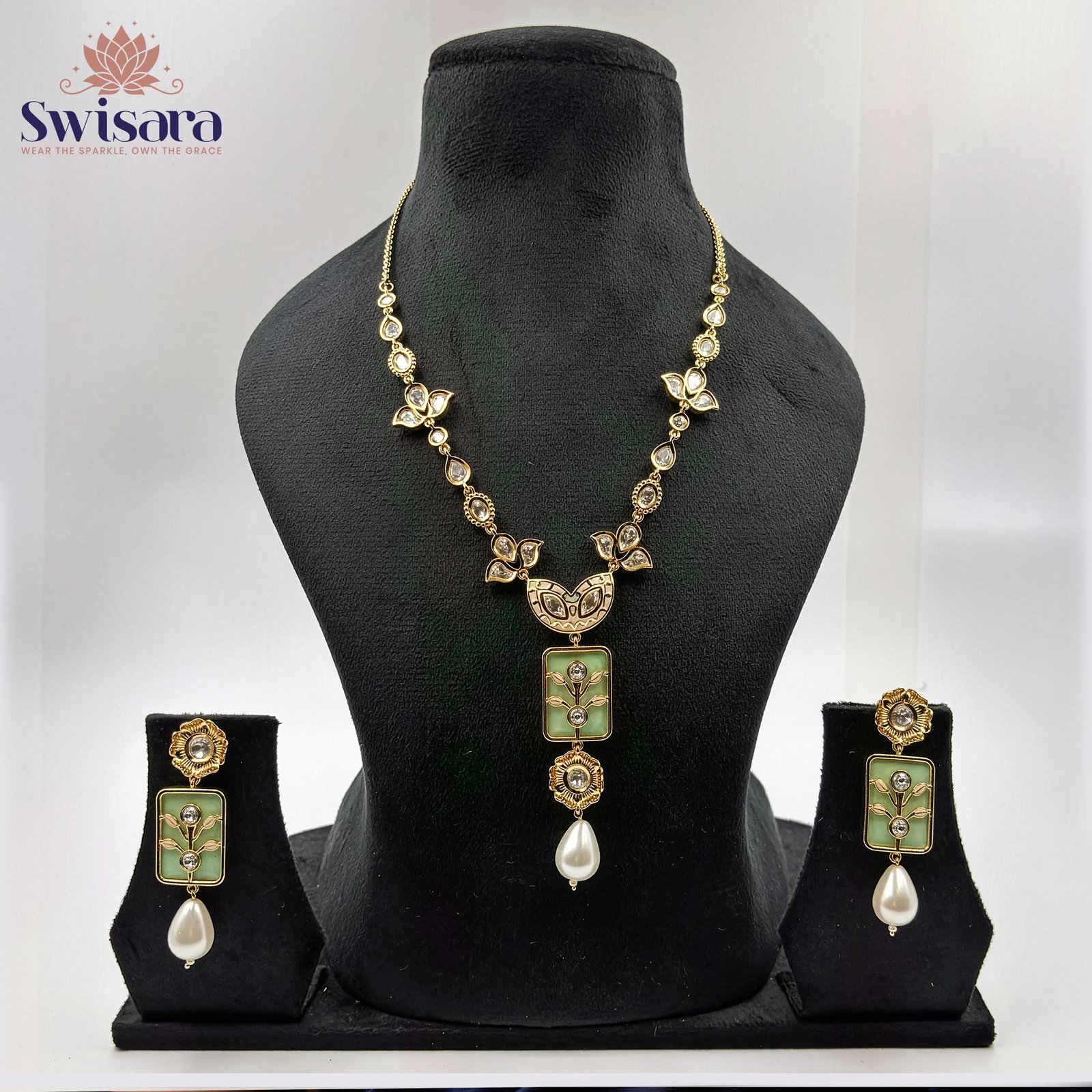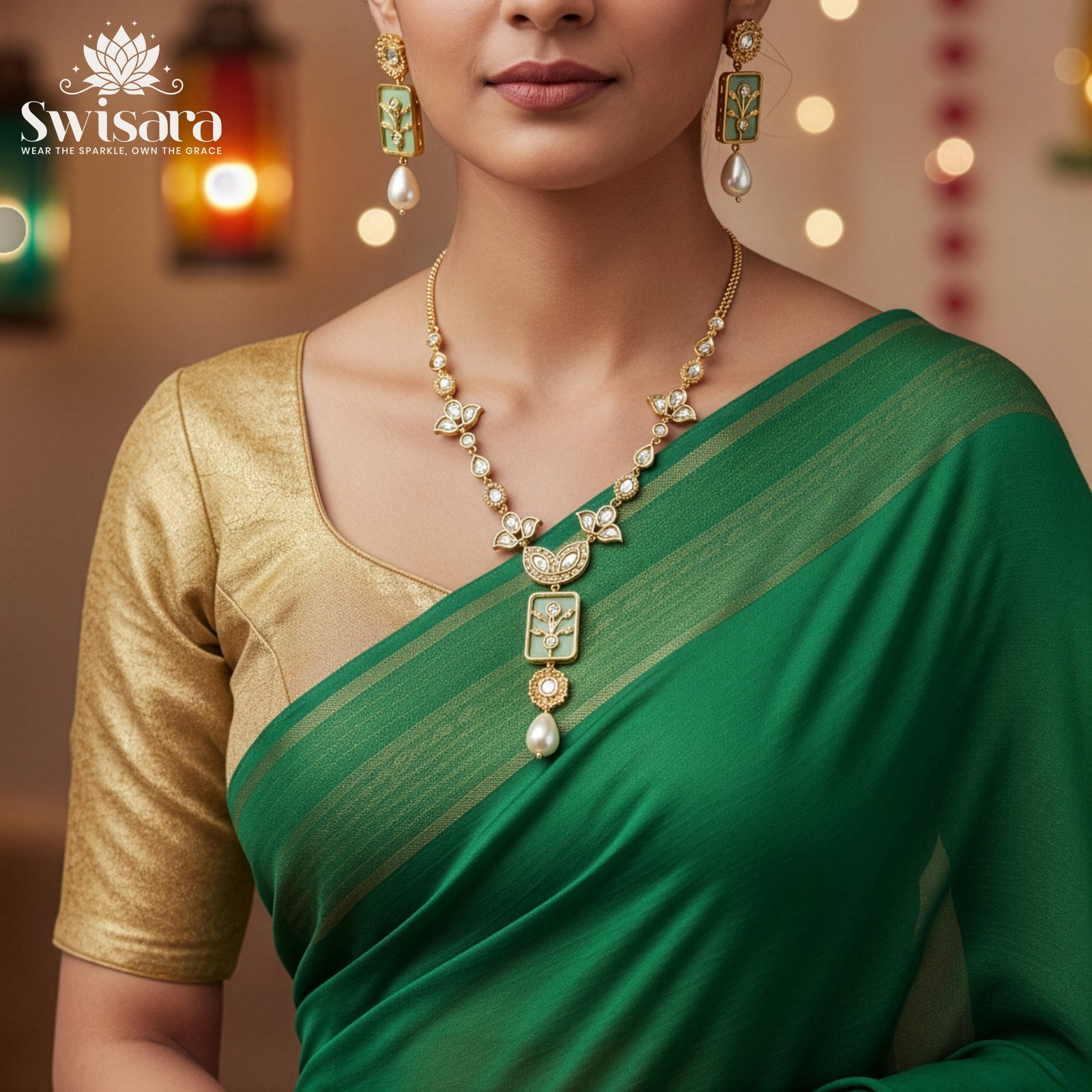 The Mehreen Enamel Drop Necklace Set by Swisara blends pastel elegance with kundan artistry. Highlighted with mint-green enamel panels, kundan stones, and pearl drop accents, this set radiates sophistication.