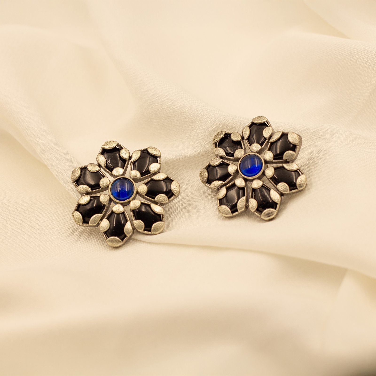 Floral stud earrings with black petal detailing and a vibrant blue center—perfect for adding a bold, elegant touch.