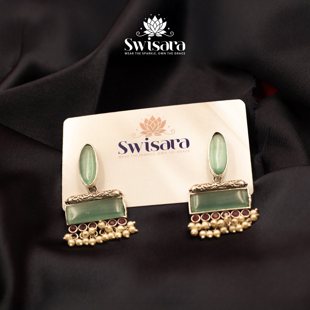 Elegant antique-style earrings with mint green stones and pearl danglers.