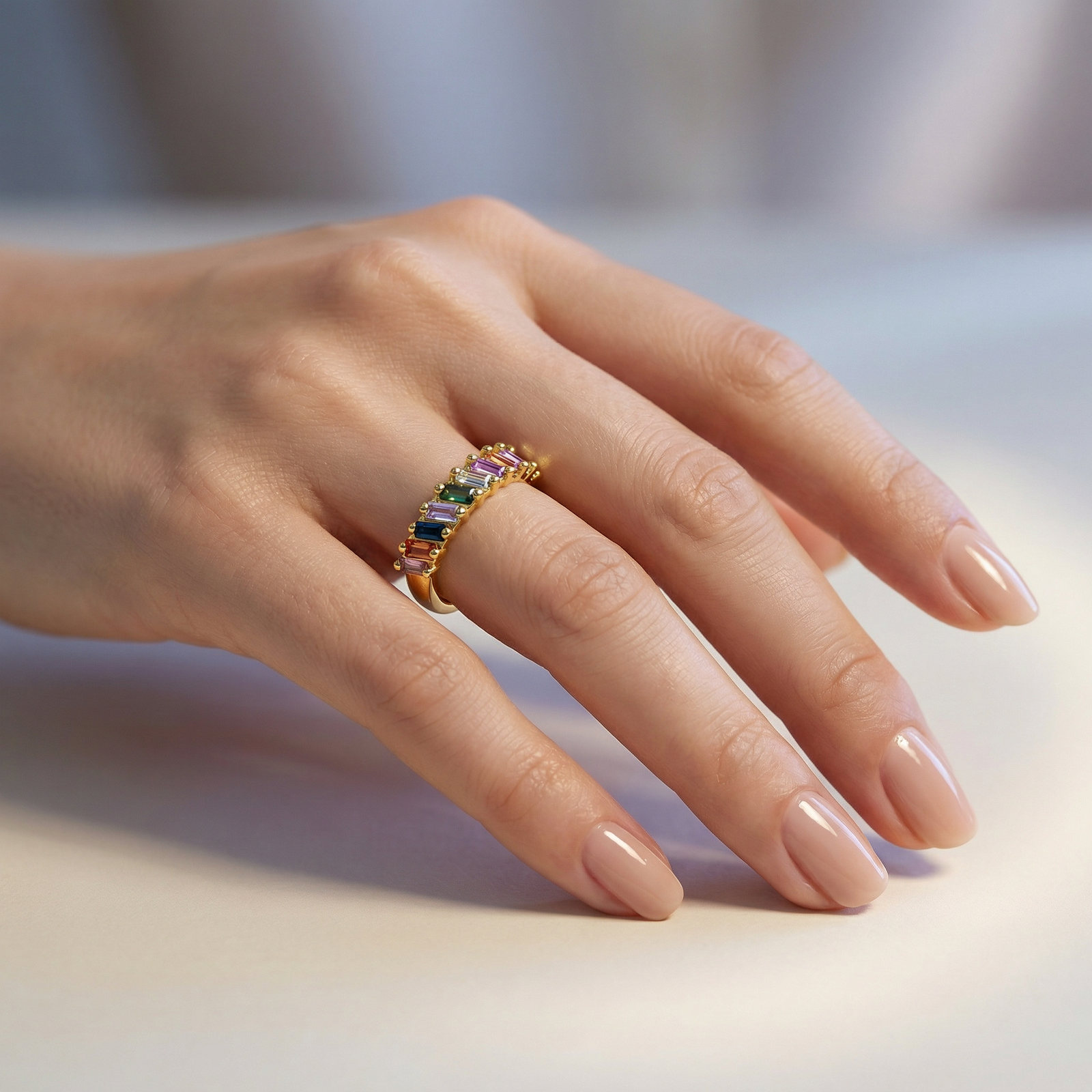 This multicolor baguette band ring for women is designed to deliver vibrant elegance with a modern stackable silhouette.