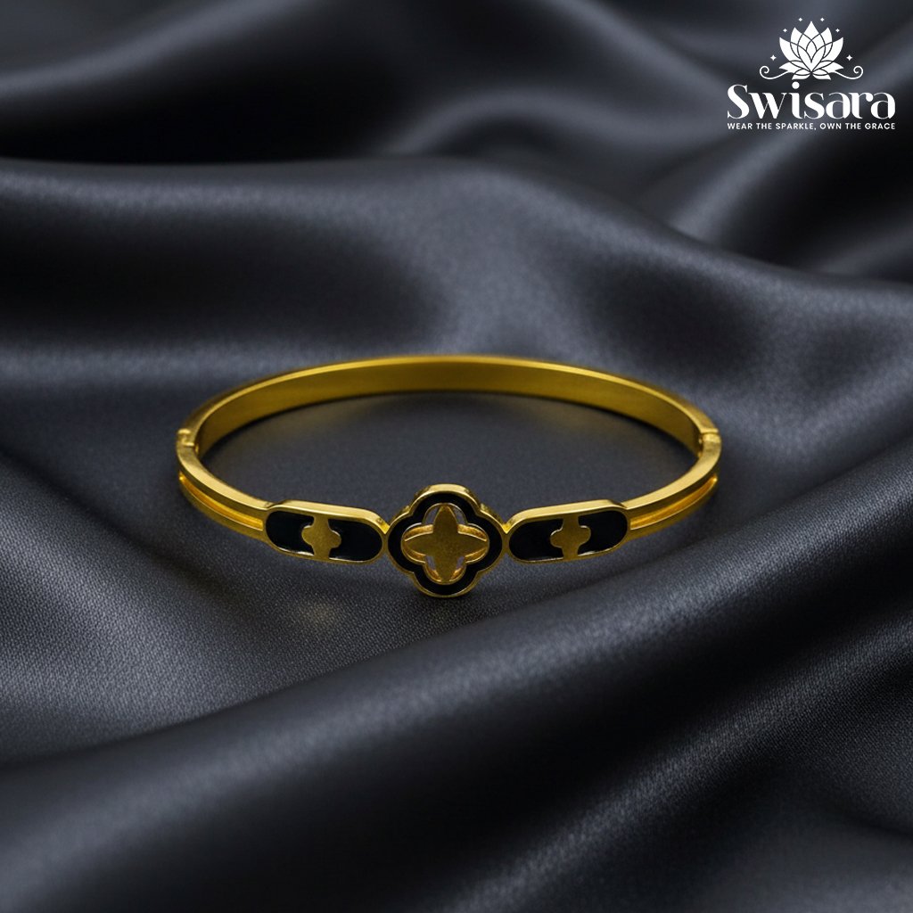 Swisara’s Noir Emblem Luxe Bangle is a perfect fusion of modern chic and classic elegance. Crafted in a radiant gold-tone finish, it features a central clover emblem highlighted with glossy black enamel and a symmetrical layout that adds sophistication.