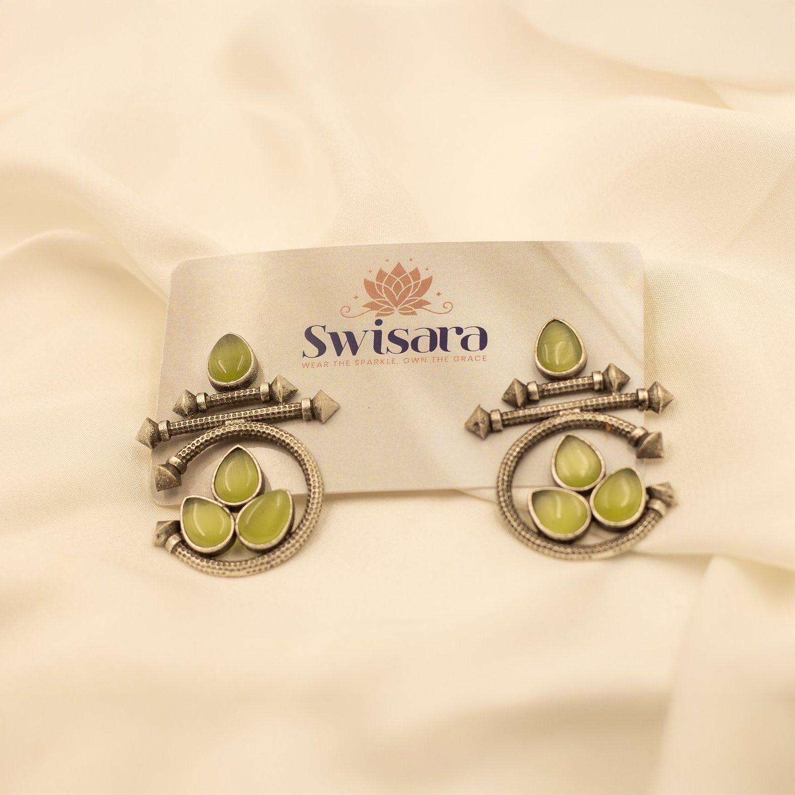 Make a statement with Swisaraโs Olive Grace Tribal Earrings. Crafted in a striking oxidised silver-tone finish, these earrings showcase a unique spiral motif adorned with teardrop-shaped olive green stones. The intricate tribal-inspired design gives it a heritage charm, perfect for ethnic outfits, festive events, or Indo-western fusion looks. Their lightweight yet impactful presence makes them an essential addition to your jewelry collection.