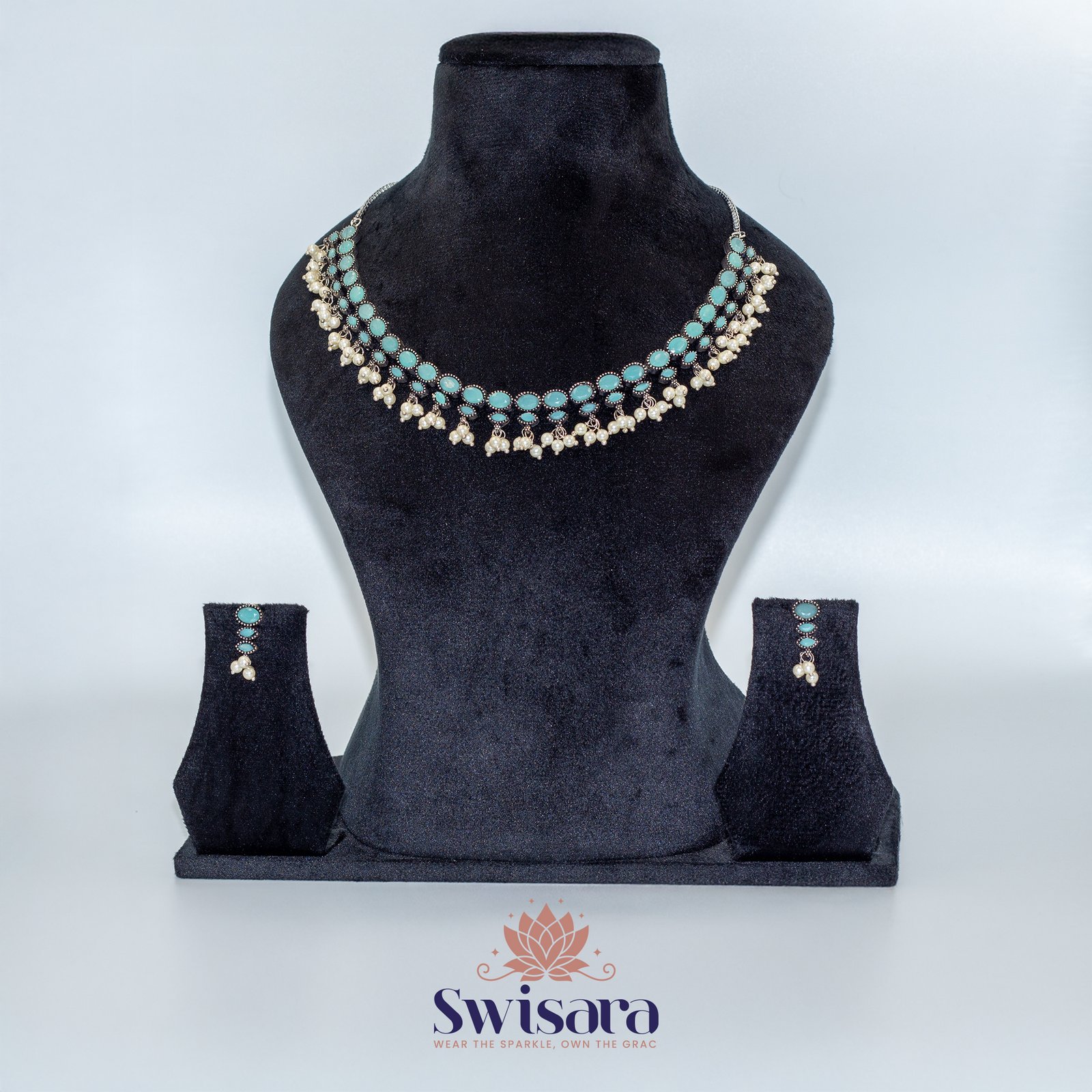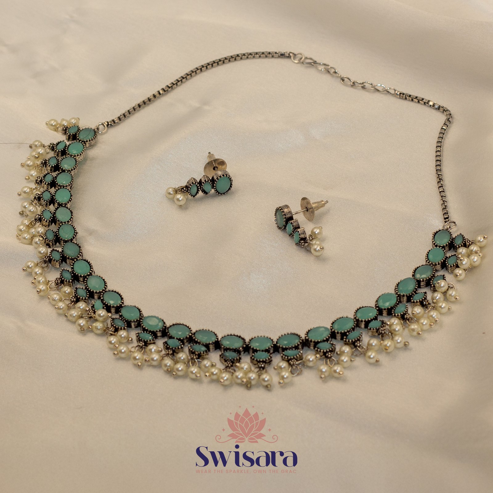 Bring your ethnic look to life with Swisara’s Pearl Drape Turquoise Necklace Set. This stunning oxidised necklace is adorned with vibrant turquoise-colored stones arranged in a symmetrical vine design. Each stone is bordered by black antique polish and complemented with elegant faux pearl hangings that sway gracefully with every movement. Matching earrings complete the traditional ensemble, making it ideal for festive occasions and cultural celebrations.