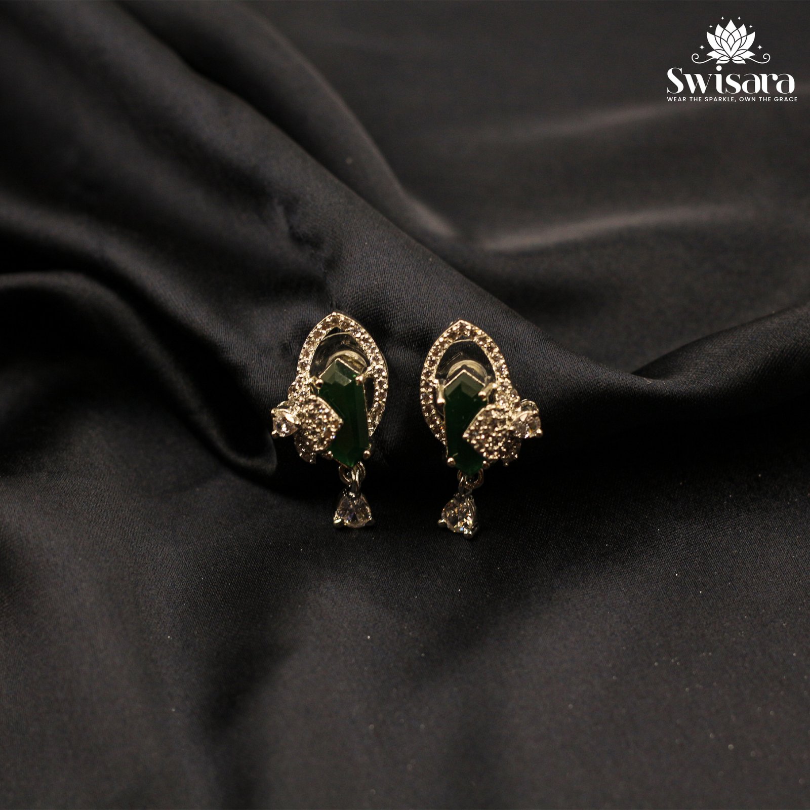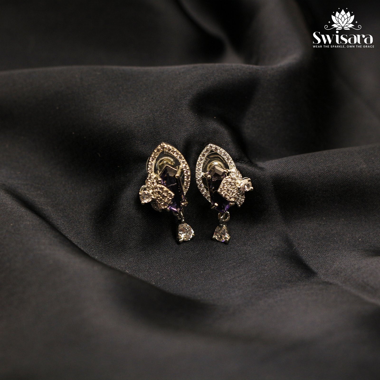 Turn heads with these radiant petal drop earrings – a stunning blend of elegance and sparkle. Each pair features a vibrant baguette-cut crystal at the center, wrapped in a delicate teardrop-shaped halo of fine stones, with a dangling solitaire-like drop that adds graceful movement. The floral motif and symmetrical design make them ideal for weddings, festive gatherings, or evening celebrations. Available in rich jewel tones to match your style.