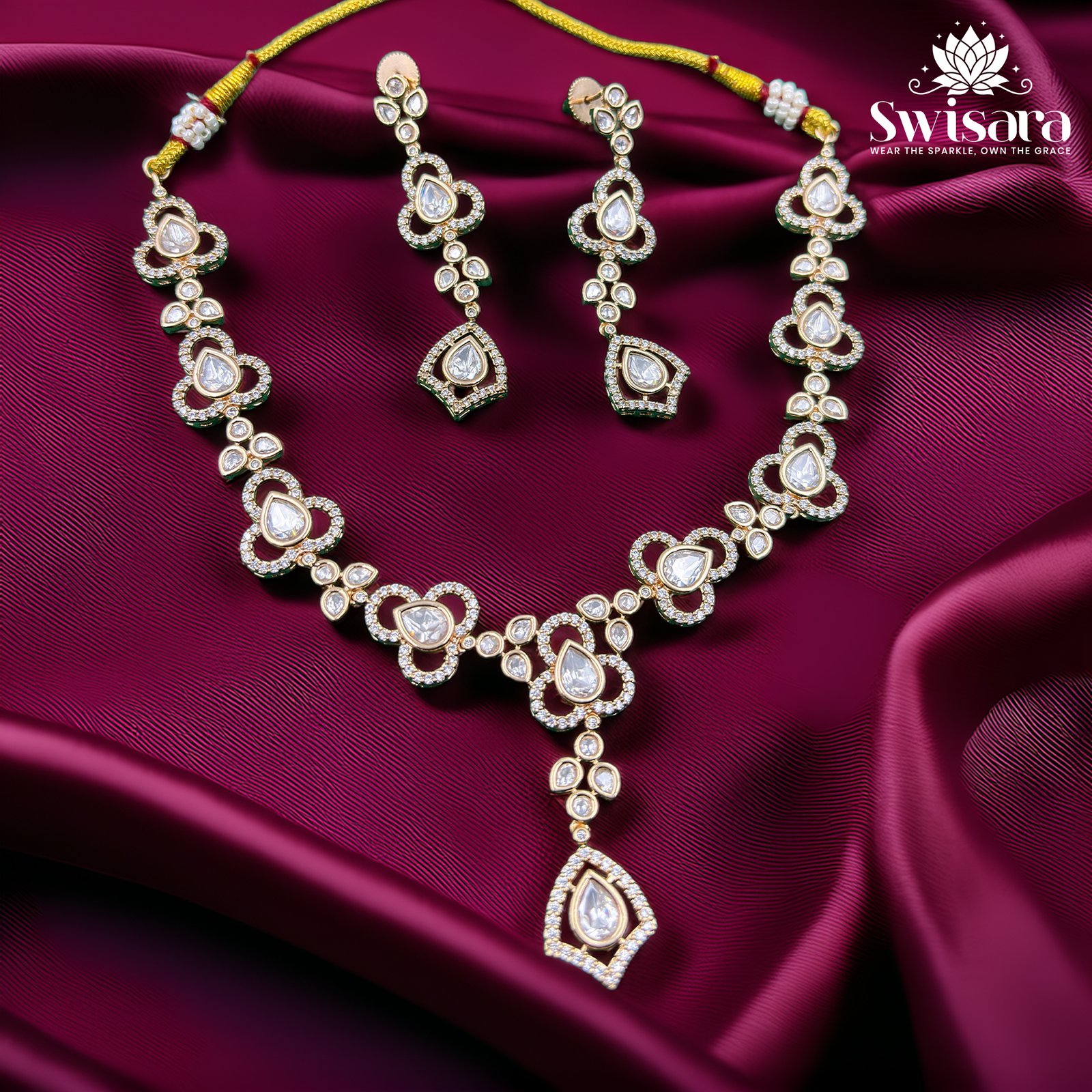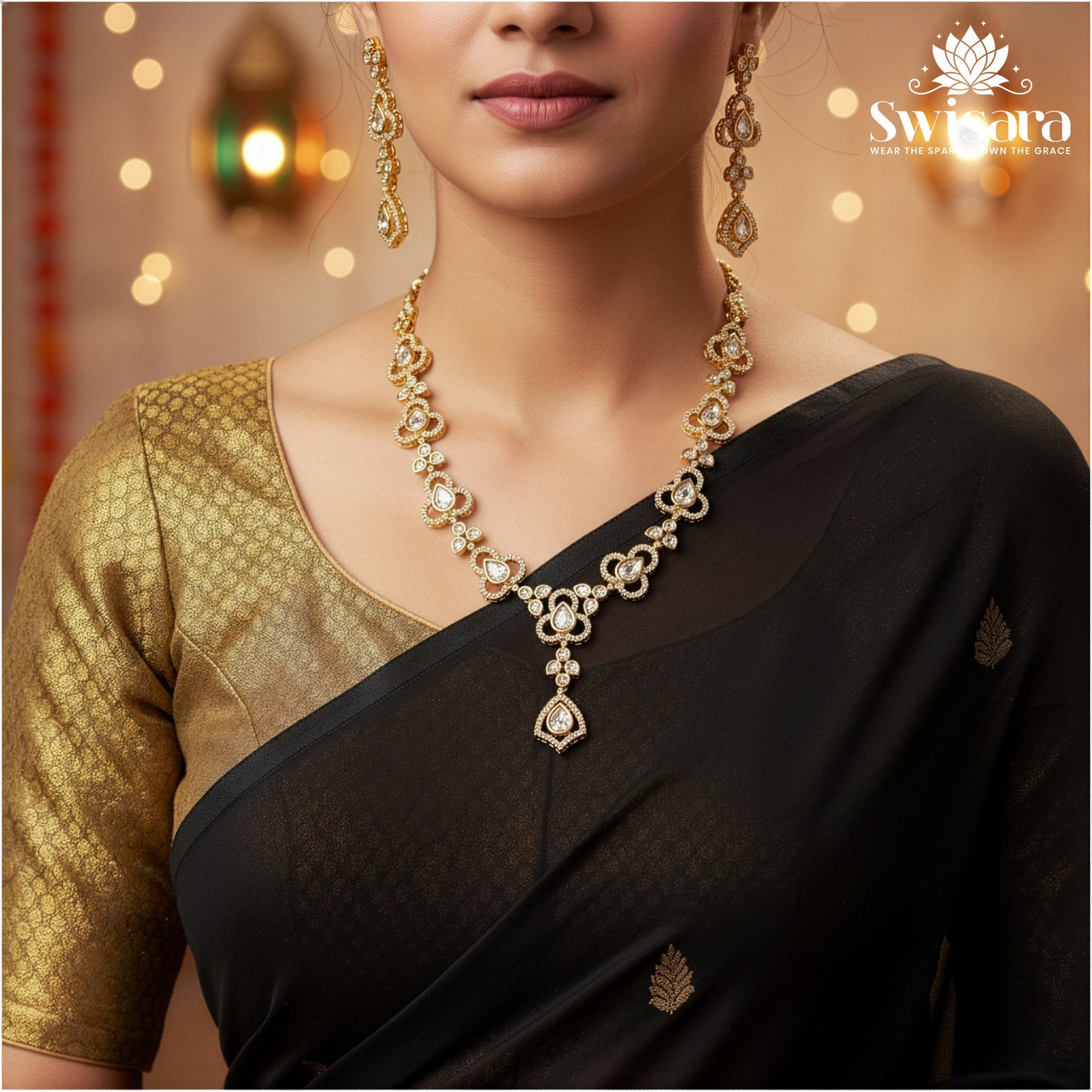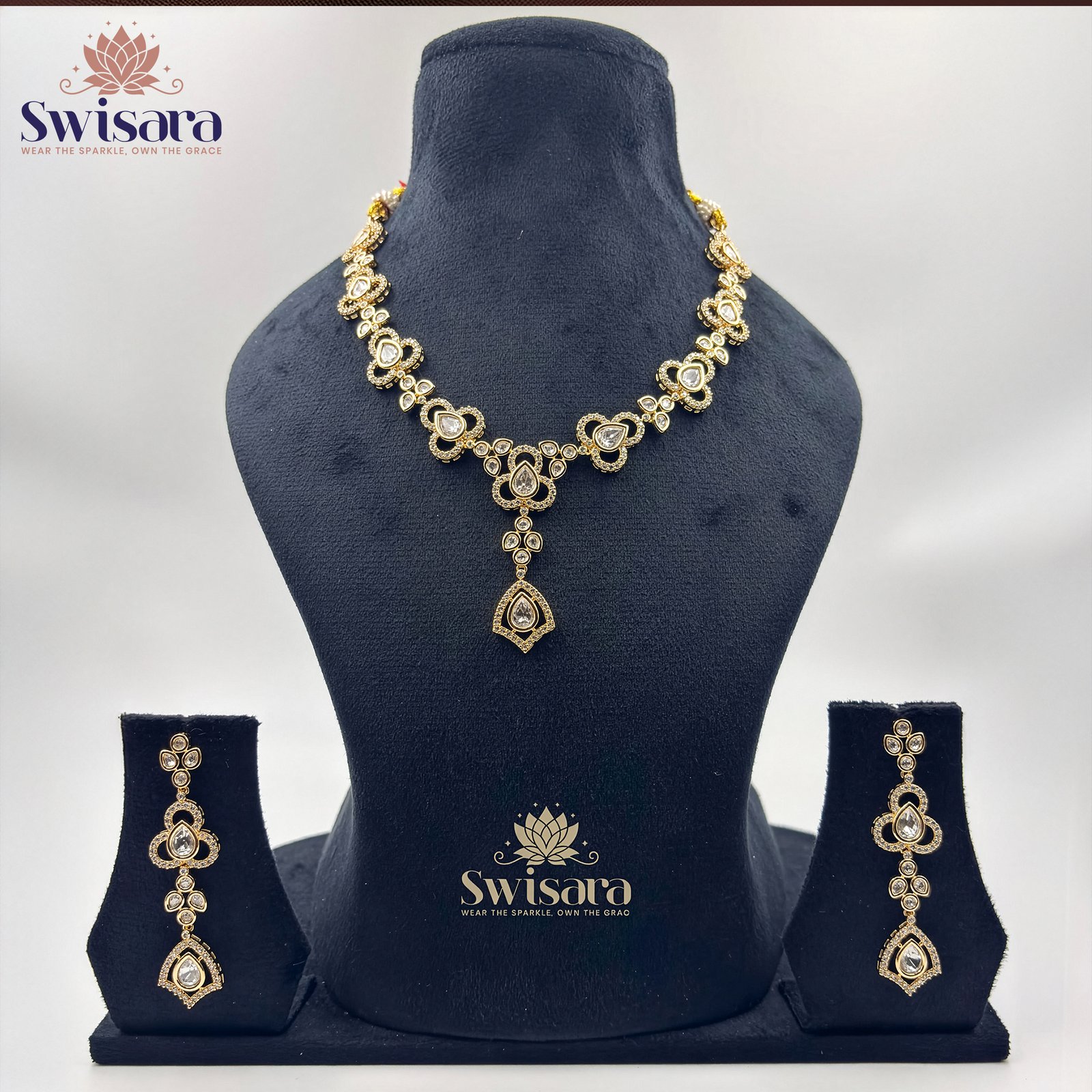 The Royal Mirror Kundan Necklace Set by Swisara is a statement piece designed for weddings and grand celebrations. Crafted with intricate kundan detailing, mirror stones, and a regal gold finish, this set exudes luxury.