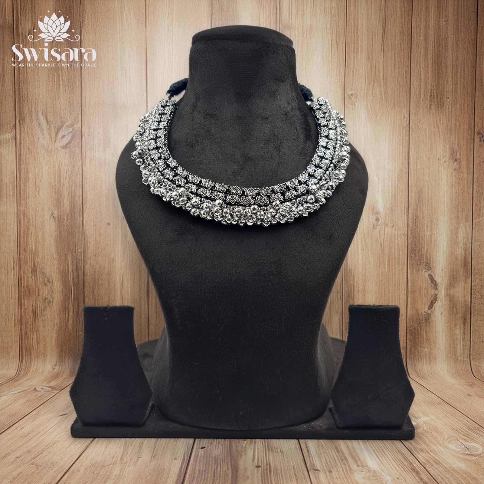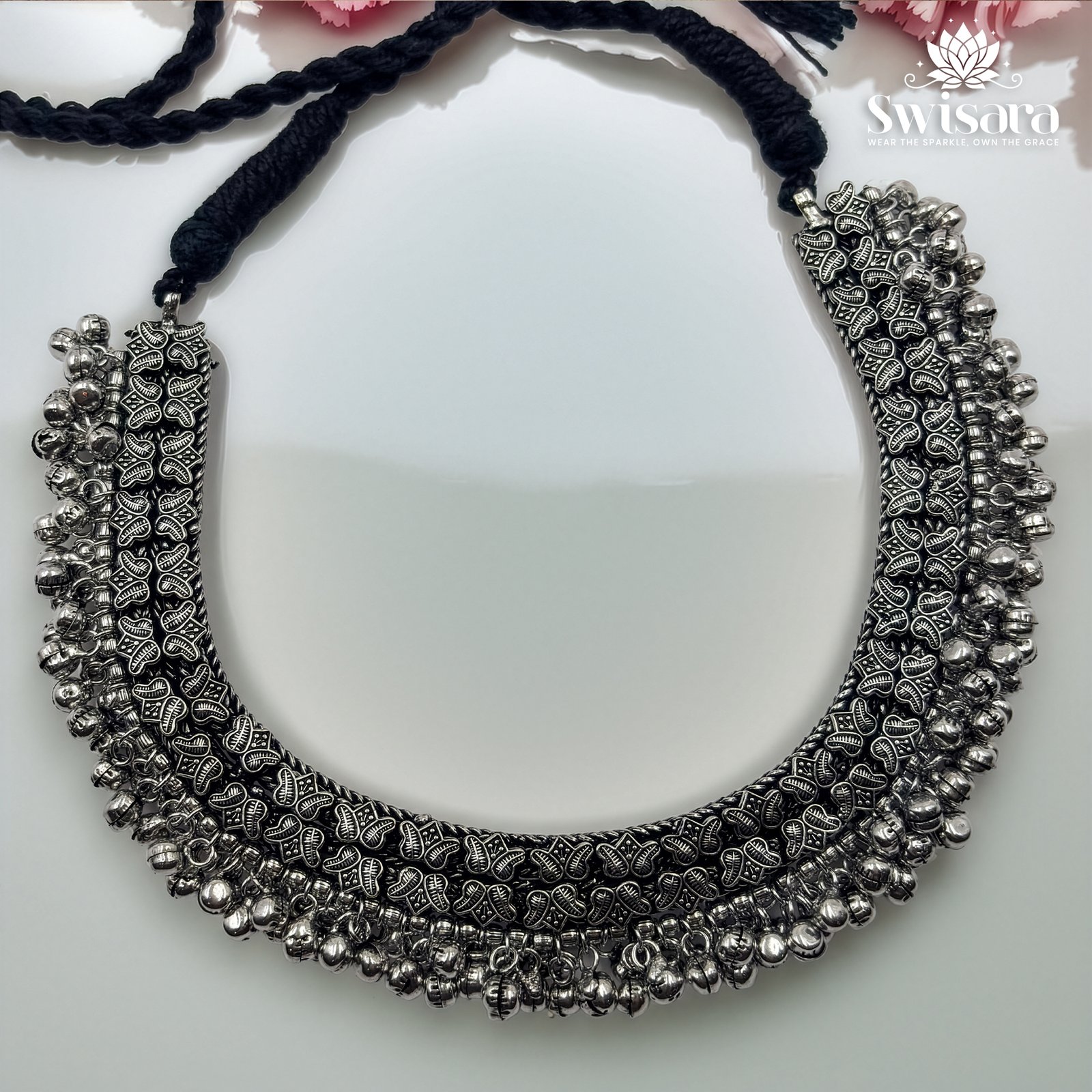 The Silver Cluster Oxidised Necklace features a bold, antique-style design crafted on a brass base with silver polish. This statement piece showcases layered silver beads, intricate floral engravings, and a heavy oxidised finish that adds traditional charm.