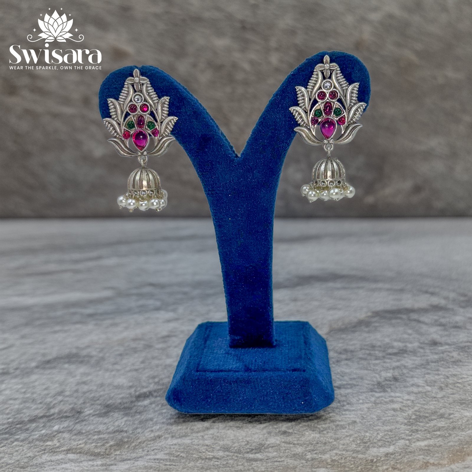 • Brass base with silver polish, lotus-inspired oxidised jhumkas studded with red & green stones and pearl droplets.