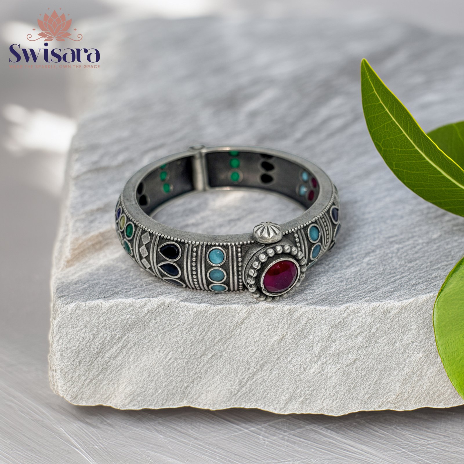Elevate your ethnic look with the Swisara Antique Ruby Accent Kada, crafted in an oxidised silver finish and adorned with intricate geometric motifs and multicolour enamel accents. The centerpiece features a striking ruby-toned stone that adds a regal charm to this statement kada. Its premium dual-tone detailing blends traditional artistry with a modern appeal, making it perfect for weddings, festive occasions, and everyday ethnic wear.