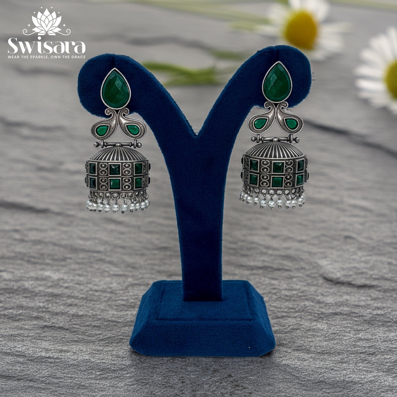 Step into timeless elegance with the Swisara Emerald Grace Dual-Tone Jhumka Earrings, crafted from premium brass base with silver polish. Featuring lush green stones with oxidised detailing and delicate pearl accents, these jhumkas blend ethnic charm with modern appeal. Lightweight yet sturdy, they’re perfect for weddings, festive occasions, or everyday ethnic wear.