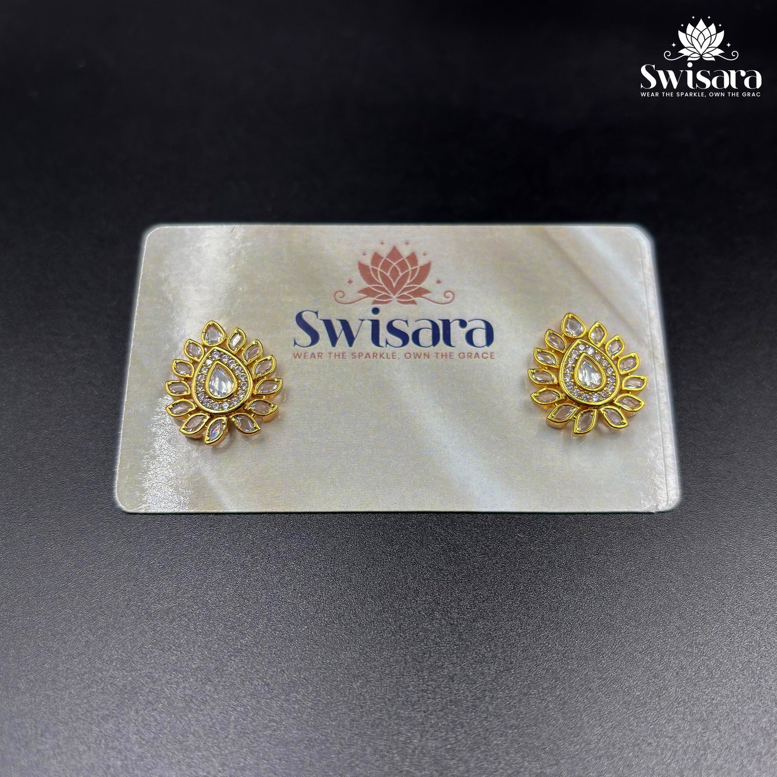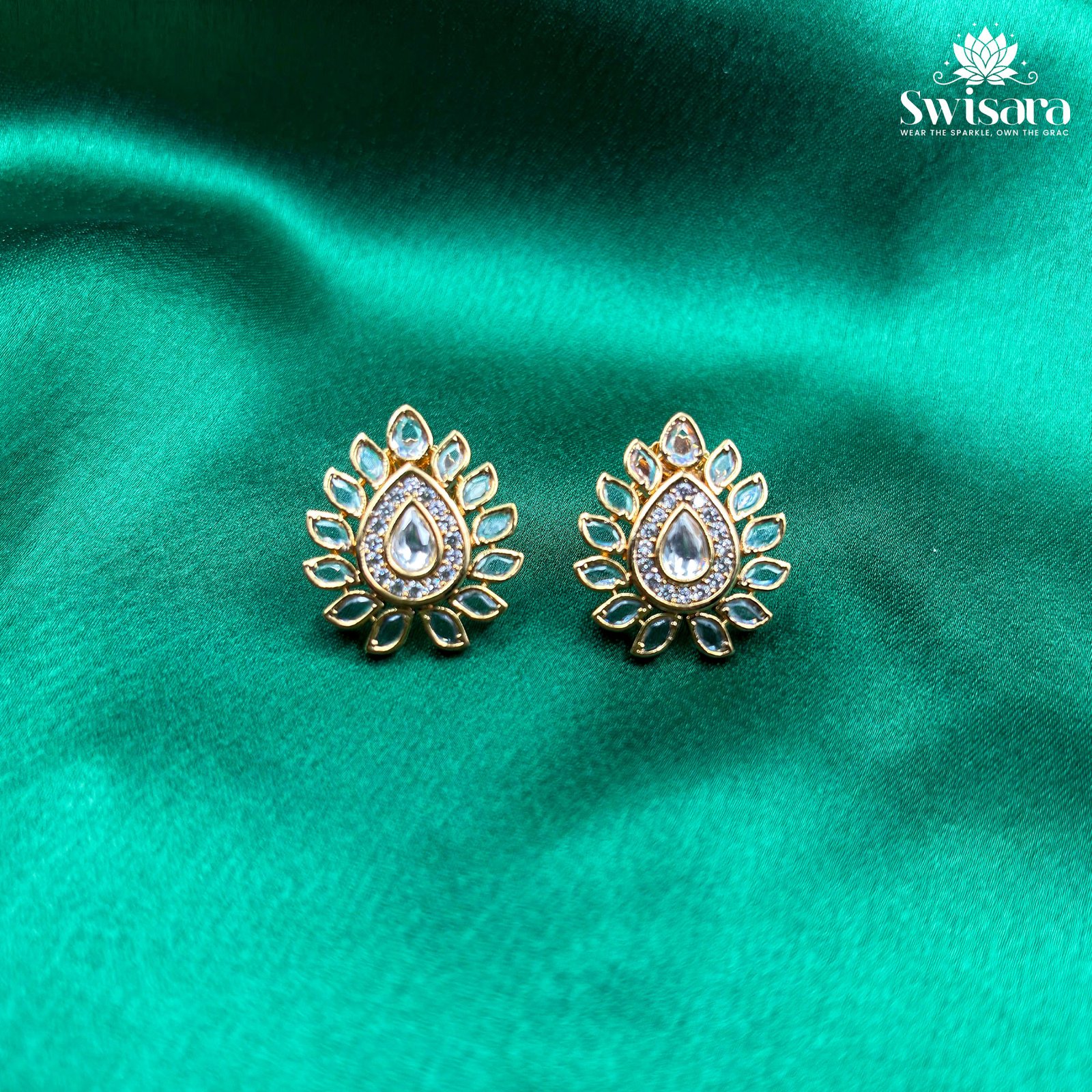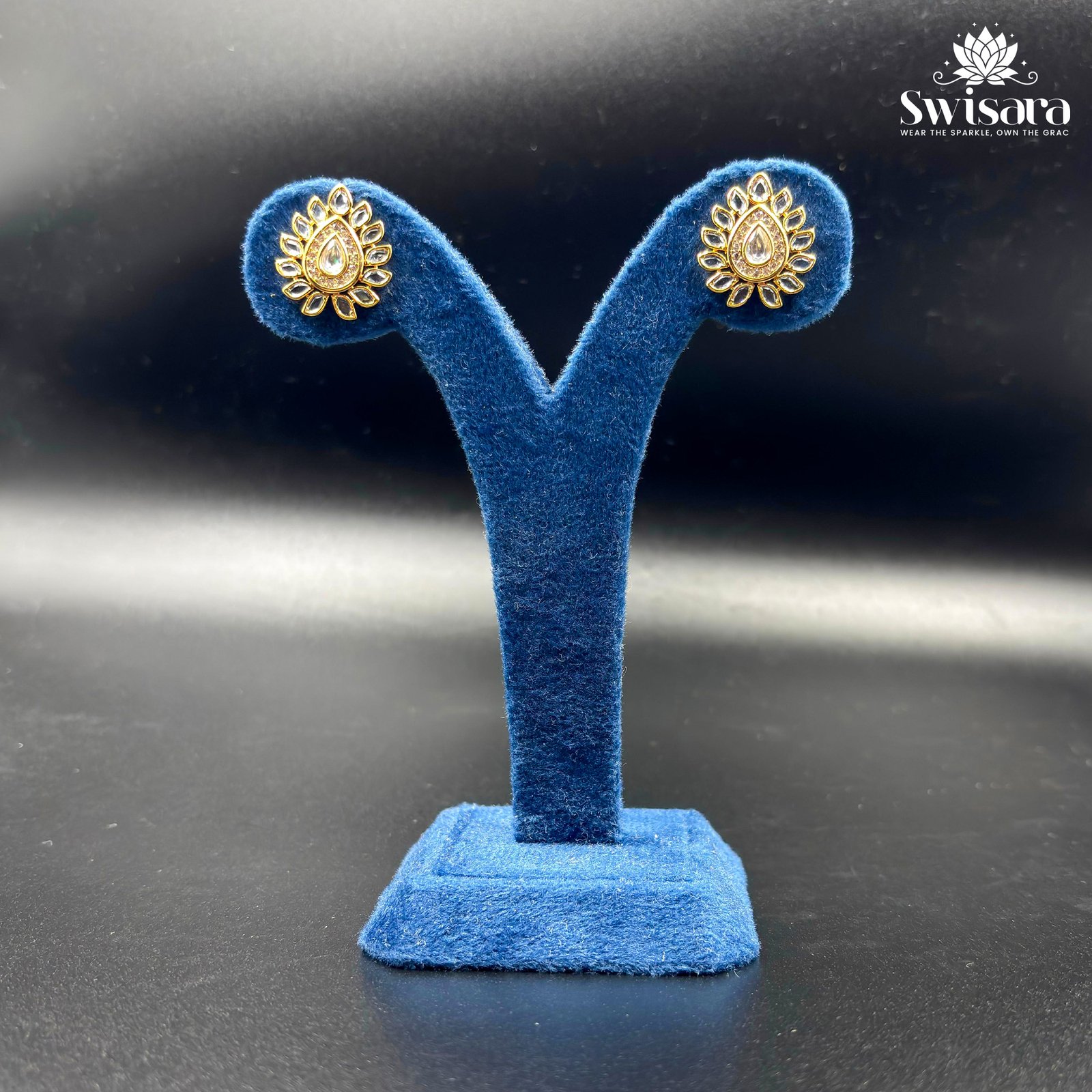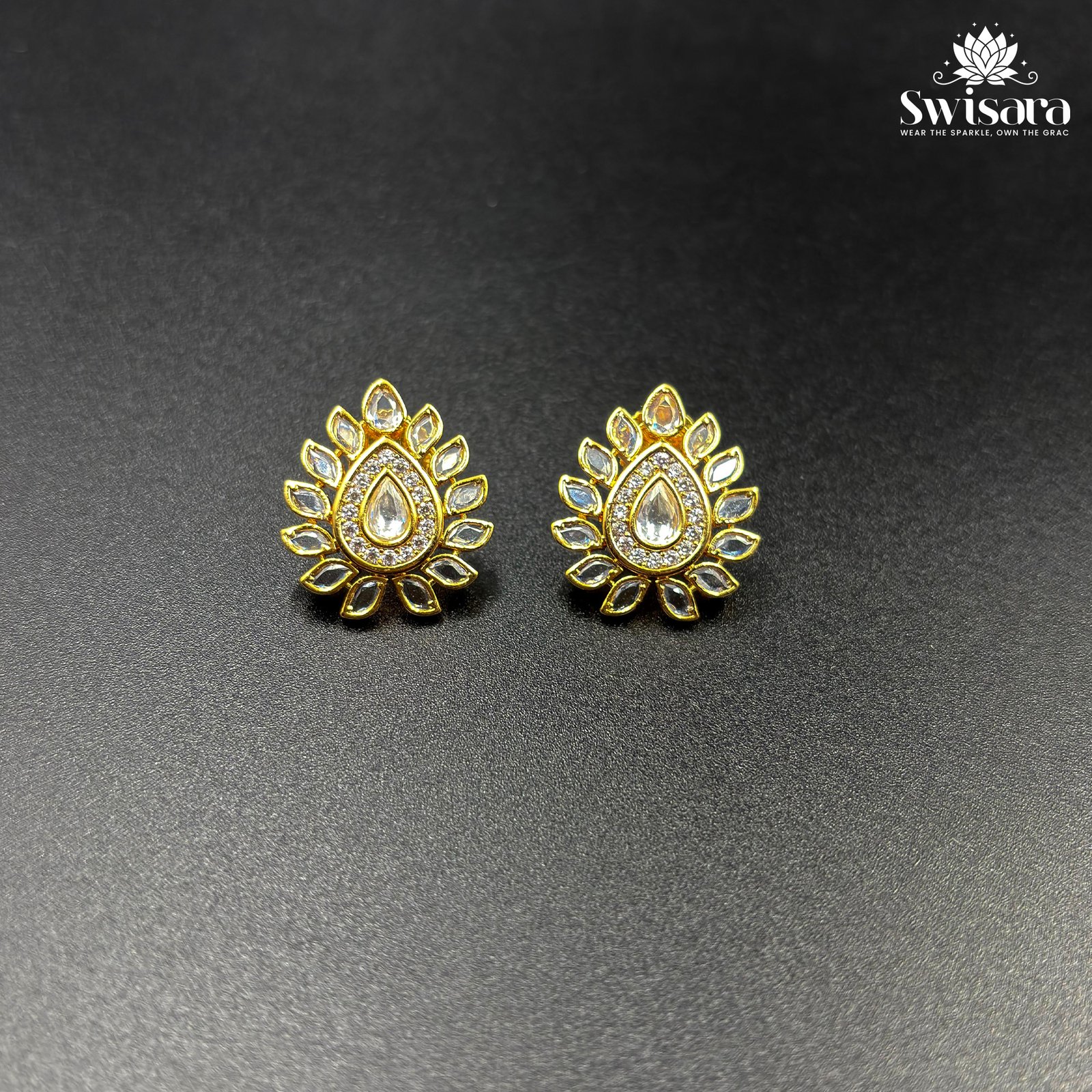 Grace your ears with the radiance of tradition through Swisara’s Tejasvi Kundan Bloom Stud Earrings. Crafted in a blooming lotus silhouette, these earrings feature a glistening teardrop kundan stone at the center, encircled by petal-shaped clear stones for an elegant sparkle. The lightweight design makes them perfect for both festive occasions and everyday ethnic styling.