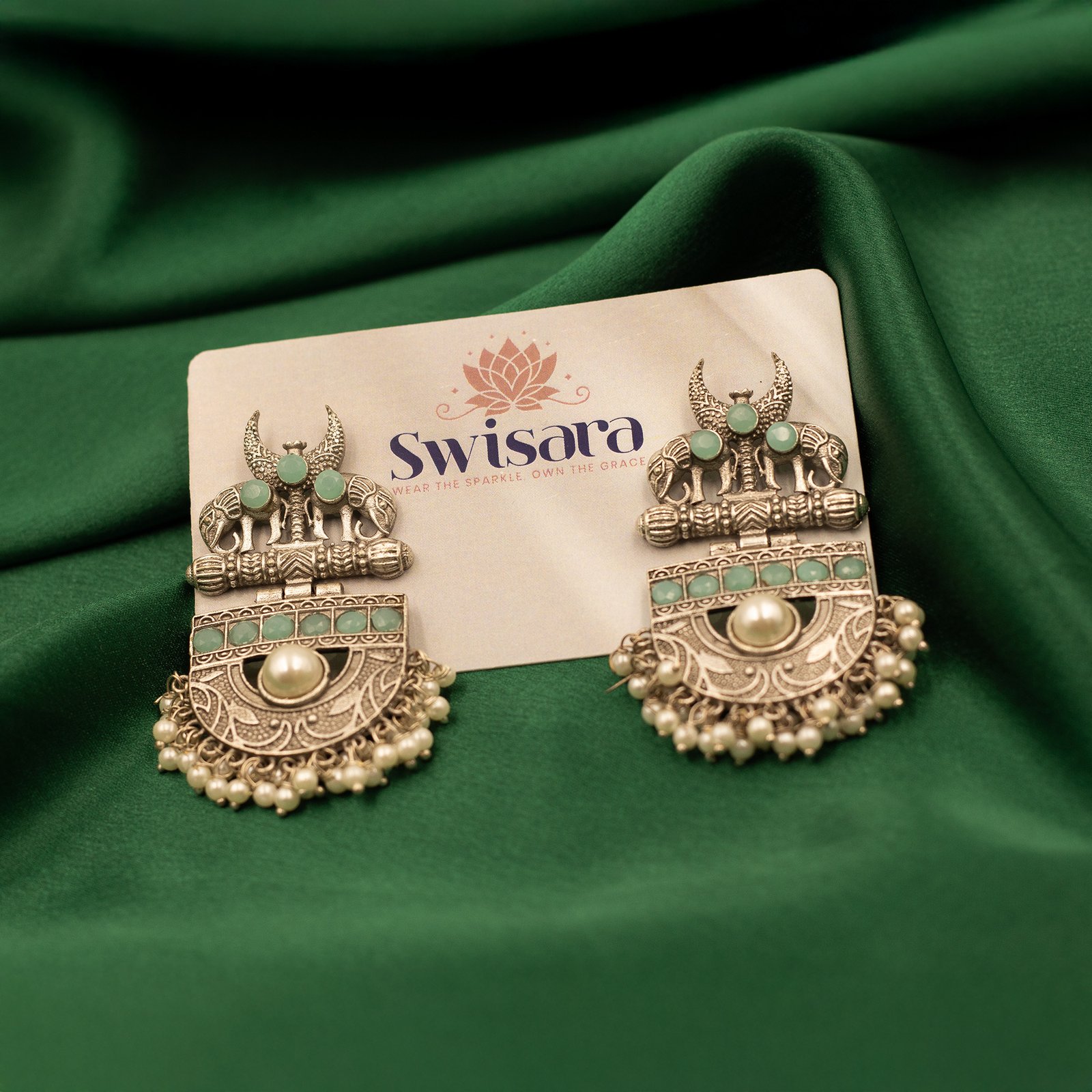 Command attention with the Tribal Majesty Half-Moon Earrings, a statement pair that blends ancient aesthetics with modern appeal. Crafted in oxidised metal, these earrings feature intricate carvings, crowned with crescent motifs, soft green enamel detailing, and a central pearl accent. A fringe of tiny pearl beads adds movement and charm, making these earrings perfect for ethnic ensembles and festive occasions.