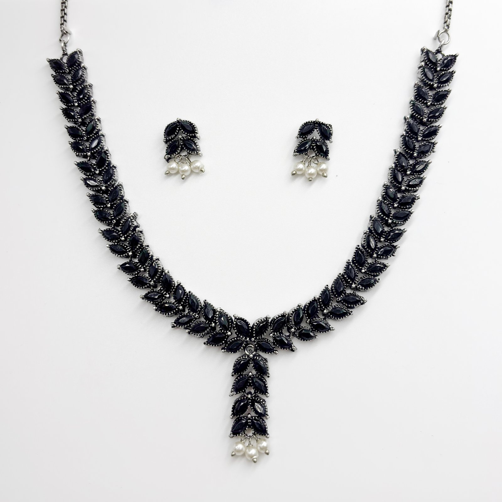 Elevate your ethnic look with Swisaraβs Varnika Oxidised Leaf Choker Set, an elegant blend of nature-inspired artistry and antique finish. Designed with detailed oxidised leaf elements and finished with delicate pearl dangles, this choker sits beautifully on the collarbone. Matching earrings complete the look for festive or traditional occasions.