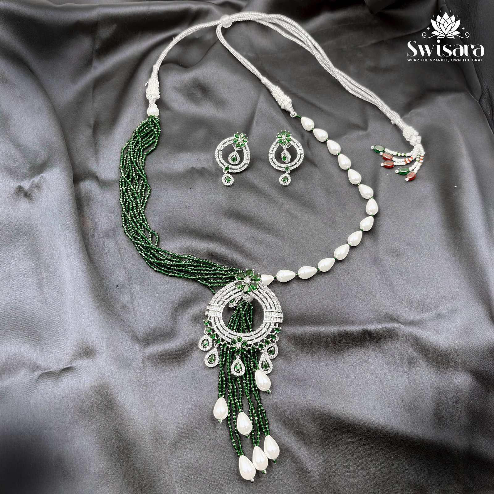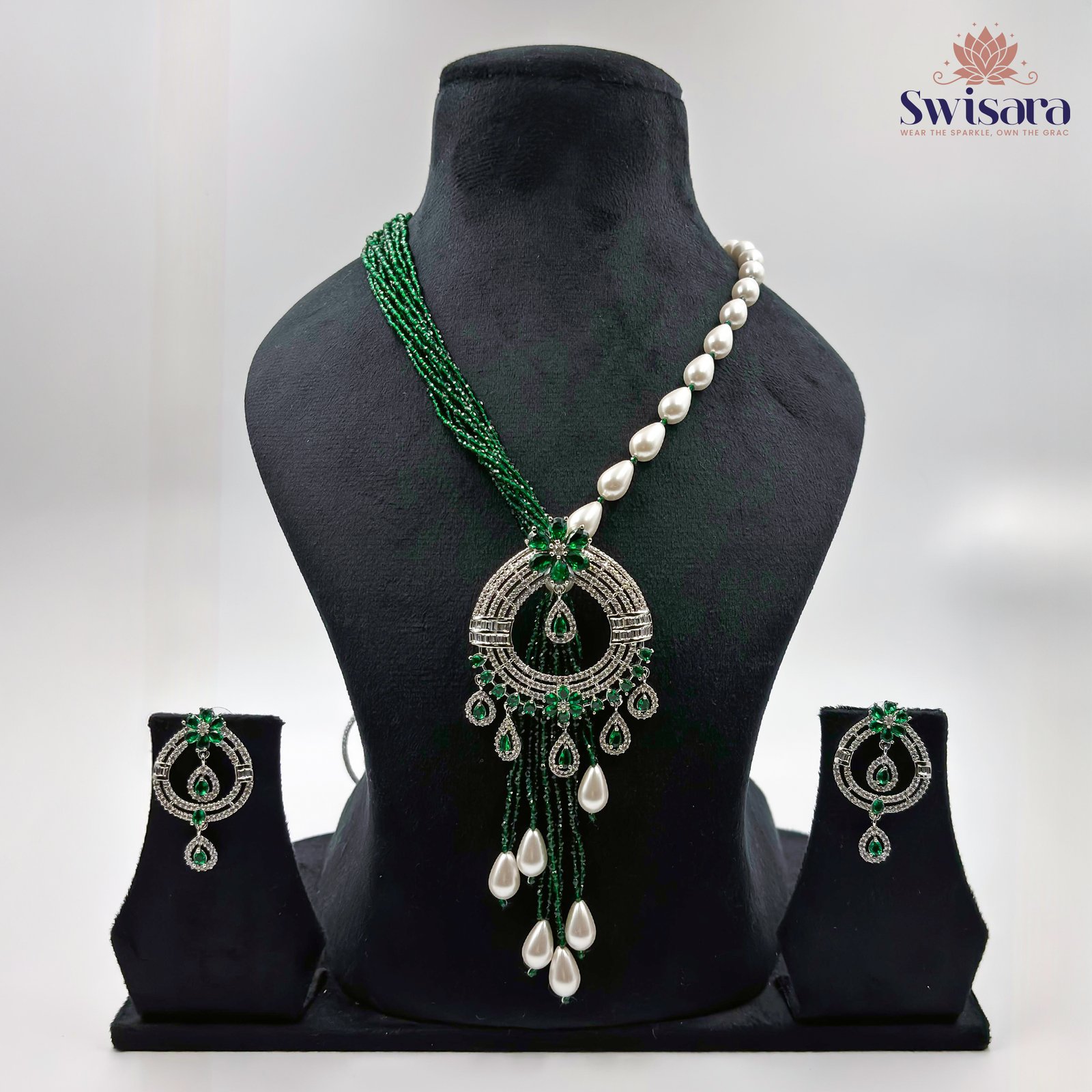 Add grandeur to your celebration look with the Zohra Emerald Cascade Necklace Set by Swisara. Designed with a stunning half-and-half layout, this set features one side of elegant white pearls and the other of vibrant green beads, joining at a majestic silver-tone circular pendant. The pendant is adorned with teardrop crystals, green stones, and delicate pearl danglers. The matching earrings mirror the central design, adding balance and elegance to the ensemble.